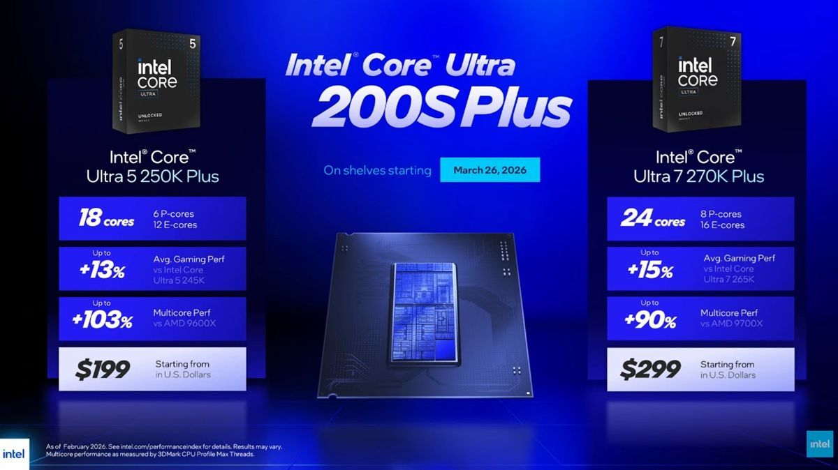 於2024年末推出的Intel Core Ultra 200S系列桌上型處理器有個不盡人意的開局,新架構與設計帶來較以往Intel平台出色的能耗效能比,然而效能的最大化卻反而略遜於舊世代平台,同時初期還遭遇系統層問題導致性能明顯低於理論值,同時偏高的定價又遭遇較早推出的AMD預防性降價,導致後續把玩家級處理器江山拱手讓出;Intel於2026年3月宣布推出Core Ultra 200S Plus系列處理器,打著Intel最佳玩家處理器的同時,以更直接的降價方式拉攏玩家,此次也收到Intel提供的Intel Core Ultra 7 270K Plus與Core Ultra 5 250K Plus進行評測。