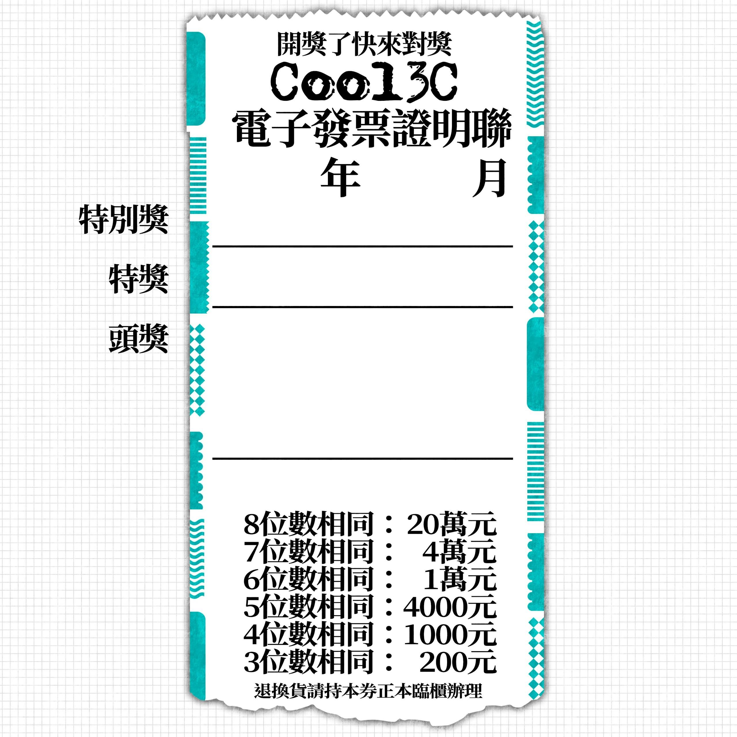 同期統一發票收執聯8位數號碼與上列號碼相同者獎金1000萬元。