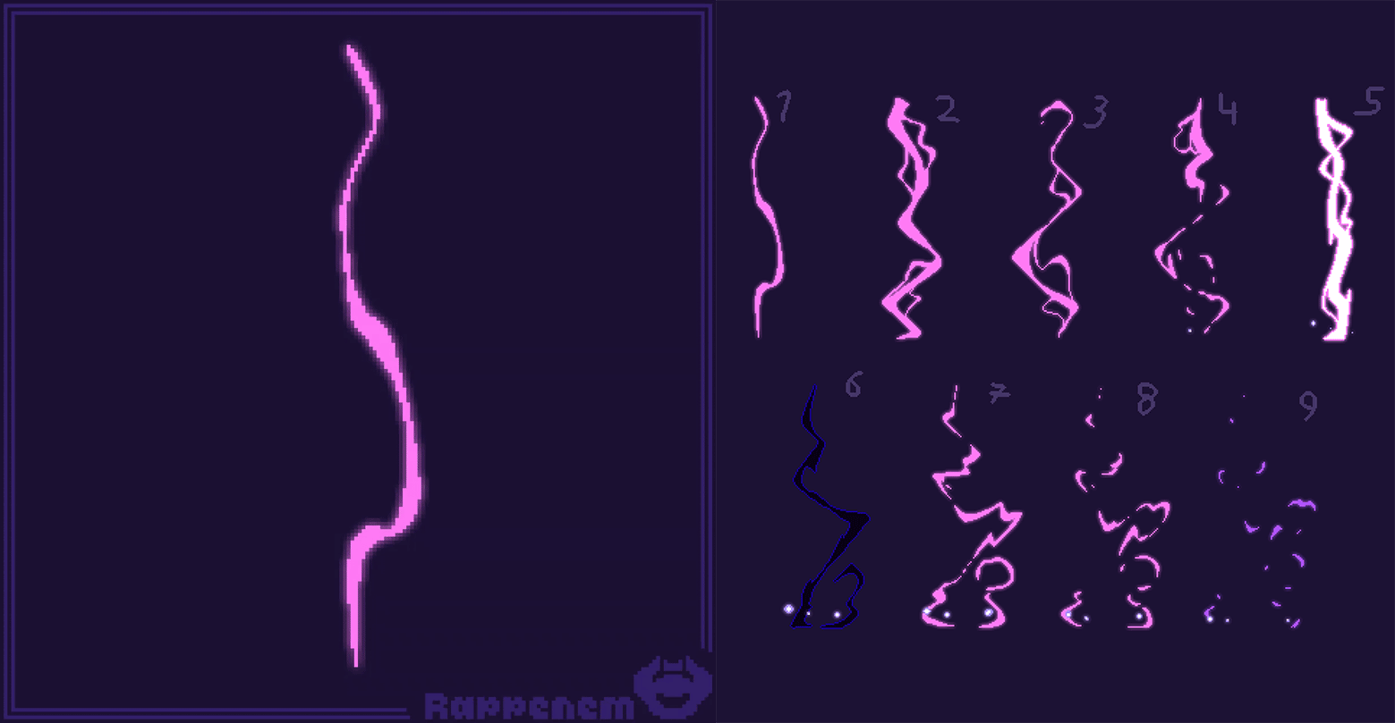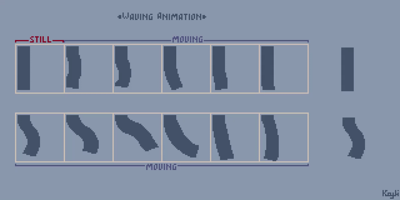 3. 像素动画教程:针对不同场景的飘动动画,下面一列显得更为剧烈,上面一列的效果则较为平缓(Twi/X: yuki_sust)。