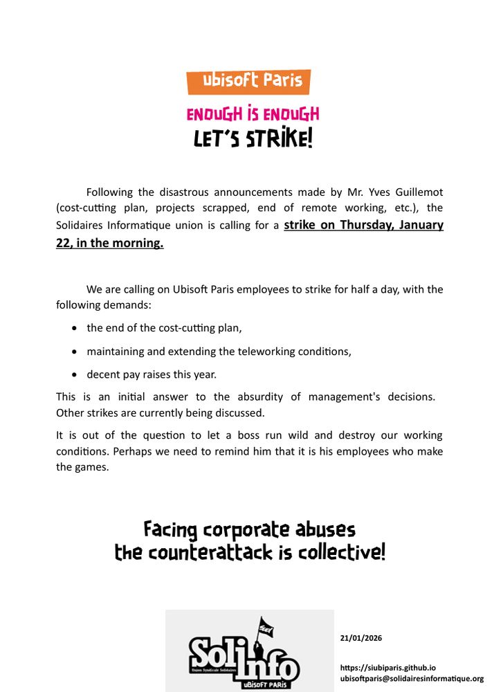 2 月 12 日,据 Game Industry 报道,针对育碧 1 月 21 日公布的新一轮成本削减计划,该公司员工发起了为期三天的国际罢工(自 2026 年 2 月 10 日至 2 月 12 日),至少有 1200 名员工参与。