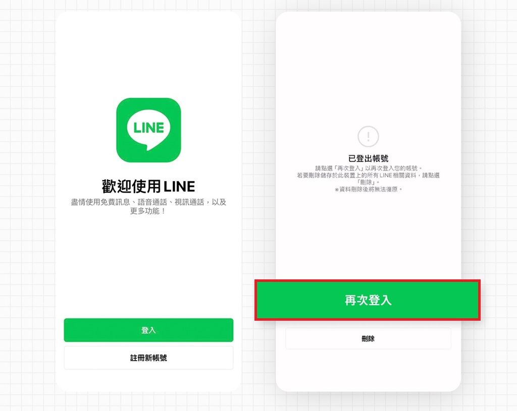 當用戶看見「再次登入」畫面時,須注意不可選擇「刪除」,必須要點選「再次登入」並依照指示完成驗證手續。當用戶通過驗證後,系統就會自動將其他裝置上的Line帳號登出,讓用戶取回原有帳號,但若是用戶沒有通過驗證,則系統會引導用戶將裝置上的所有資料刪除。