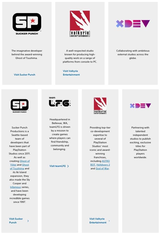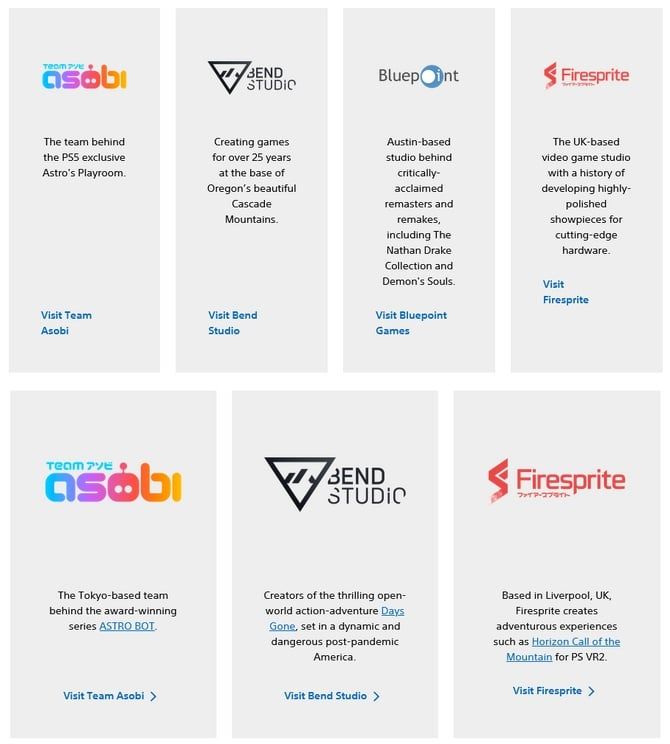 • Firesprite:原本的介紹強調該工作室「擁有為最先進硬體開發洗鍊傑作的實績」,如今被明確修改為「製作如PlayStation VR2專用遊戲《地平線 山之呼喚》等具備冒險體驗的遊戲」,直接將焦點拉回PlayStation專屬硬體。