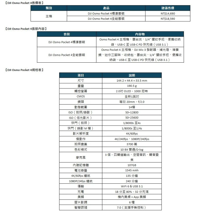 Osmo Pocket 4在台灣推出兩種組合,包含主機、雲台夾、螺紋手把、收納袋與USB PD快充線的標準套裝為14,690元,額外包括DJI Mic 3發射器、補光燈、增廣鏡、迷你三腳架的全能套裝建議售價為18,590元。