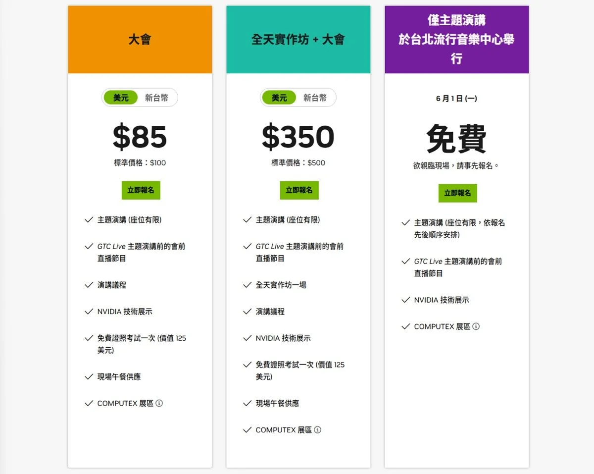 NVIDIA GTC Taipei將分為大會、大會與實作坊以及僅參與主題演講,僅參加主題演講為免費,參加大會活動為85美金,參加大會與全天實作坊為350美金。活動報名:NVIDIA
